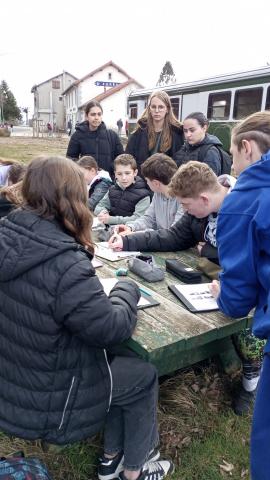 Lors de la visite, les élèves, divisés en plusieurs groupes composés d’élèves de 3° de Vernoux et d’élèves de 6° de St Agrève ont répondu ensemble à un questionnaire et se sont mis dans la peau d’architectes pour imaginer et dessiner leur propre projet de rénovation de cette ancienne gare.